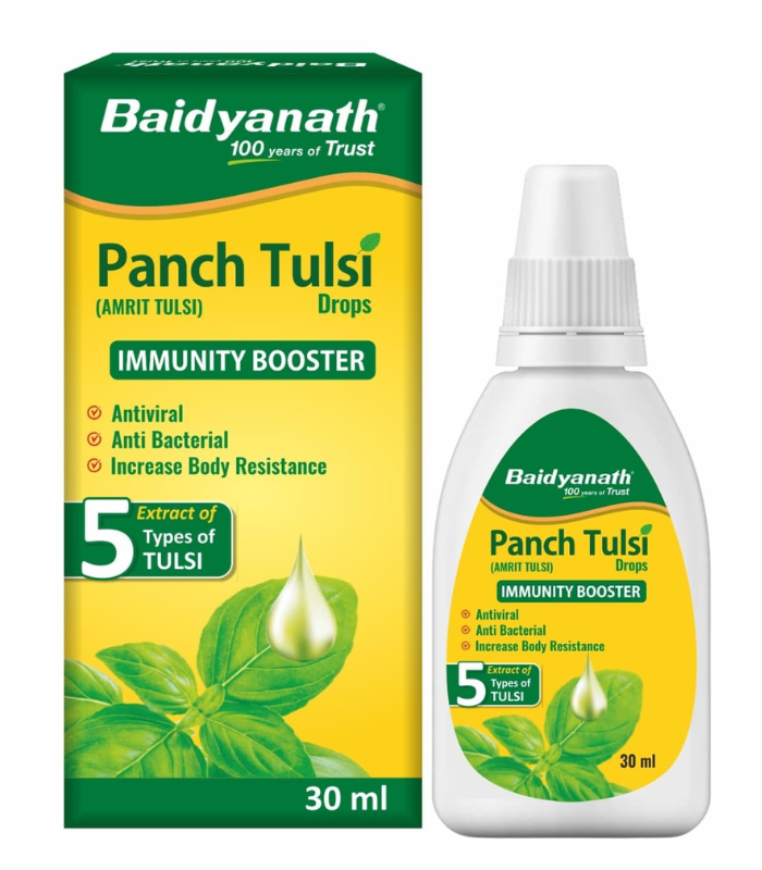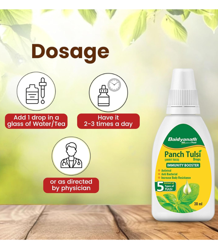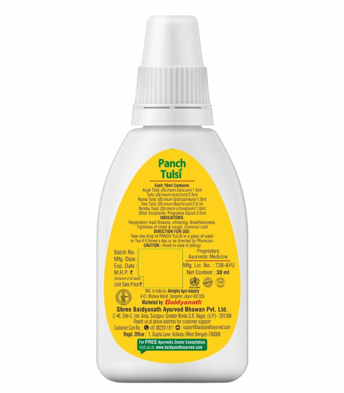 The production of Panch Tulsi Drops begins with the extraction of five medicinal Tulsi varieties—Rama, Krishna, Vana, Nimbu, and Shyama Tulsi—using cold extraction methods to preserve their natural antioxidants and therapeutic properties. The concentrated extracts are filtered, blended in precise proportions, and processed in a GMP-certified facility to maintain purity and potency. Each batch is tested for quality, microbial safety, and active compounds before being filled into sterilized liquid drop bottles, ensuring a pure and highly effective Ayurvedic formulation.