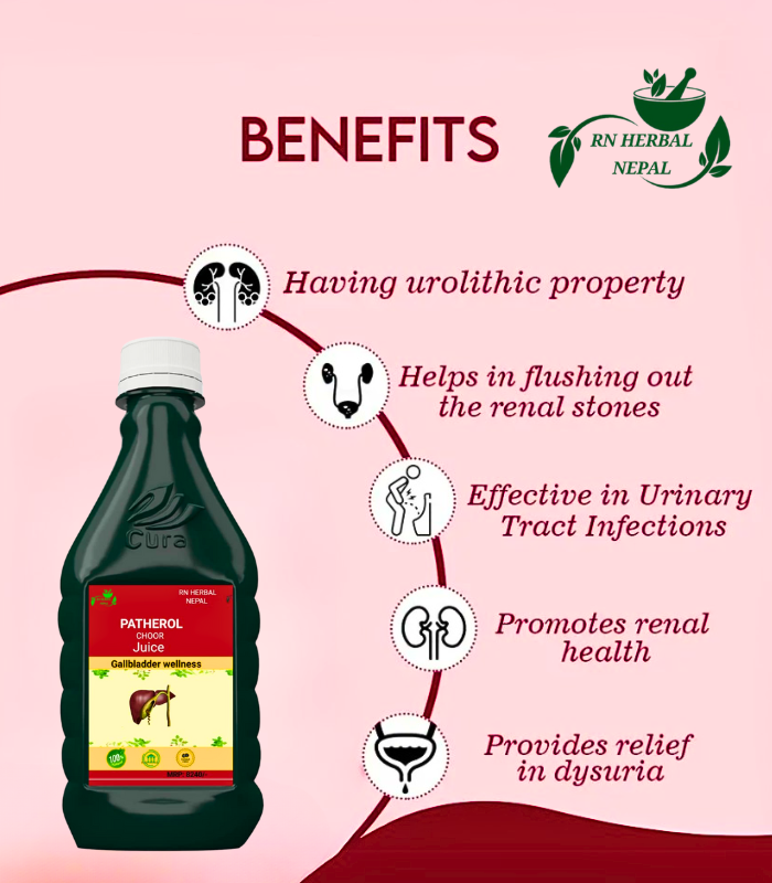 Patherol Choor Juice is a powerful Ayurvedic juice formulated to support gallbladder and kidney wellness. Enriched with natural urolithic ingredients, it helps flush out renal stones, relieve urinary tract infections, and promote healthy renal function. Made with 100% herbal ingredients, this juice is a safe and natural solution for kidney and gallbladder support.